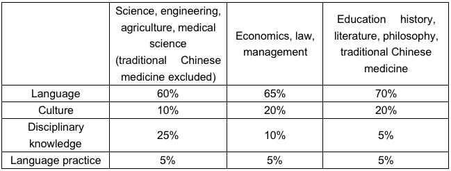 The Foundation Program must include four components: language, culture, disciplinary knowledge, and language practice. Language courses should be composed of general Chinese and Chinese for special purposes, including such lessons as comprehensive Chinese, listening, reading, oral Chinese, Chinese reading in science and technology, and Chinese listening and note-taking in science and technology, ans so on. Culture courses should involve Chinese culture, general introduction to the Chinese society, and cross-cultural communication. Disciplinary courses should contain mathematics, chemistry, physics, biology, ancient Chinese, Chinese for science and technology (or Business Chinese), and computer science. Language practice refers to those extracurricular activities such as language exercises and social surveys.