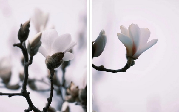 When magnolias bloom,No leaves appear on the branches, only flowers—Each one like a dove resting on the bough,So pure, so pristine in their whiteness.