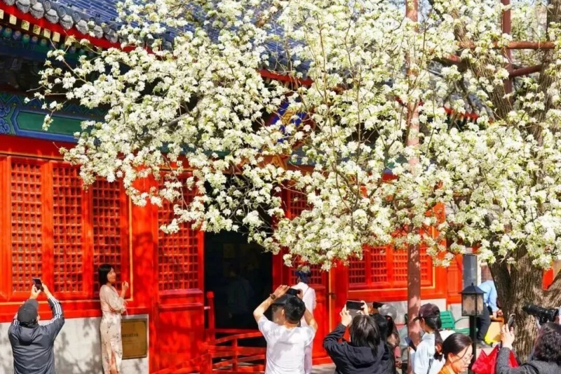 Spring is in full swing, and the century-old pear trees at Zhihua Temple have quietly burst into bloom. The scene of petals cascading like a gentle shower is truly unmissable. After you finish touring there, make your way to Galaxy SOHO, a strikingly modern white architectural complex. Here, you can pick a café for a peaceful break.